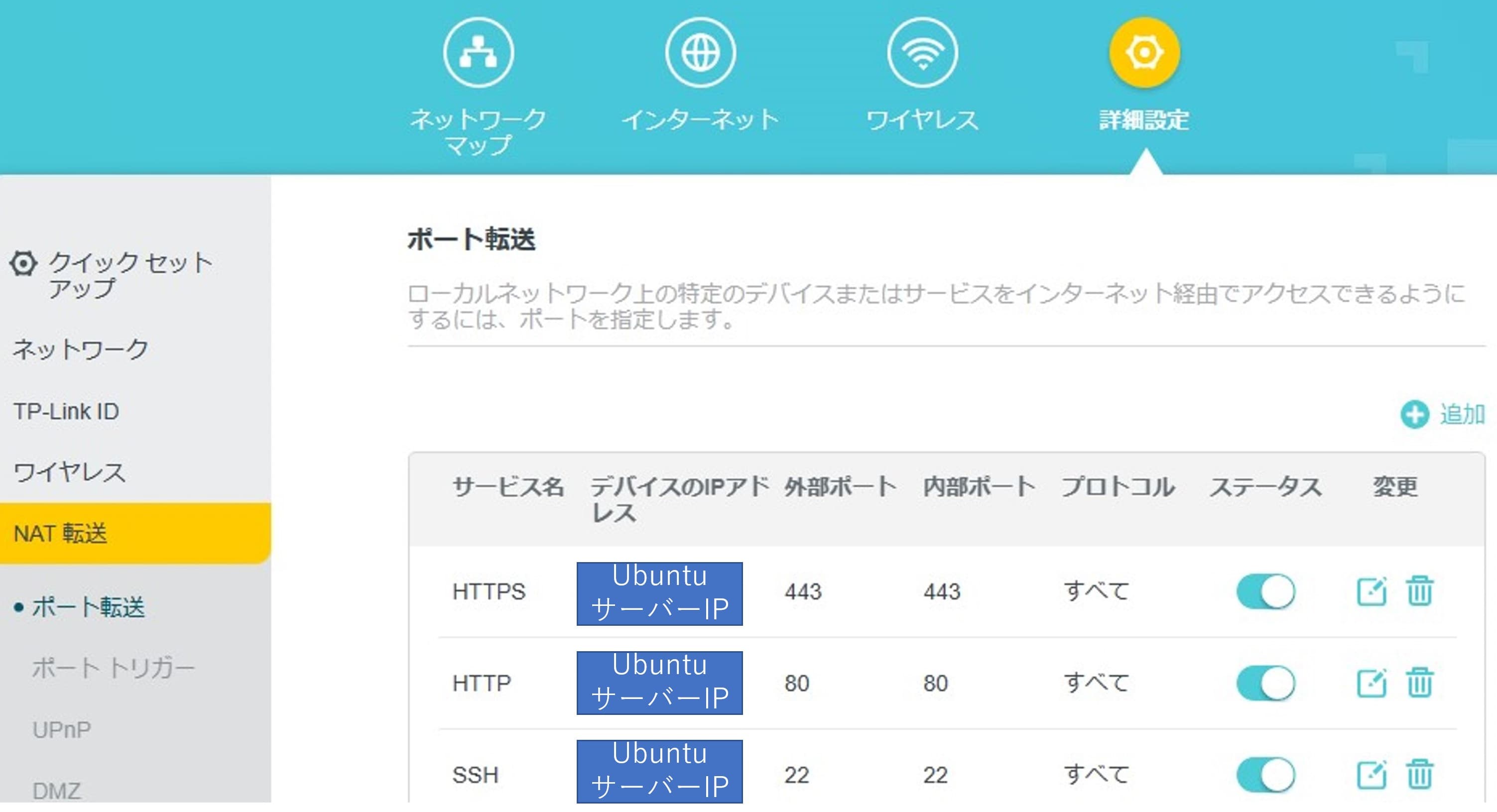 ポートフォワーディングを適用することで、外部ネットワークからSSH接続ができるようにします。DMZではなく、 ポートフォワーディングを利用することで、初心者でも比較的安全なセキュリティを確保できます。 この手順は、ルーターによって設定方法が異なります。今回は、tp-link社を想定します。 ローカルポートフォワーディングとは別物であるので注意してください。