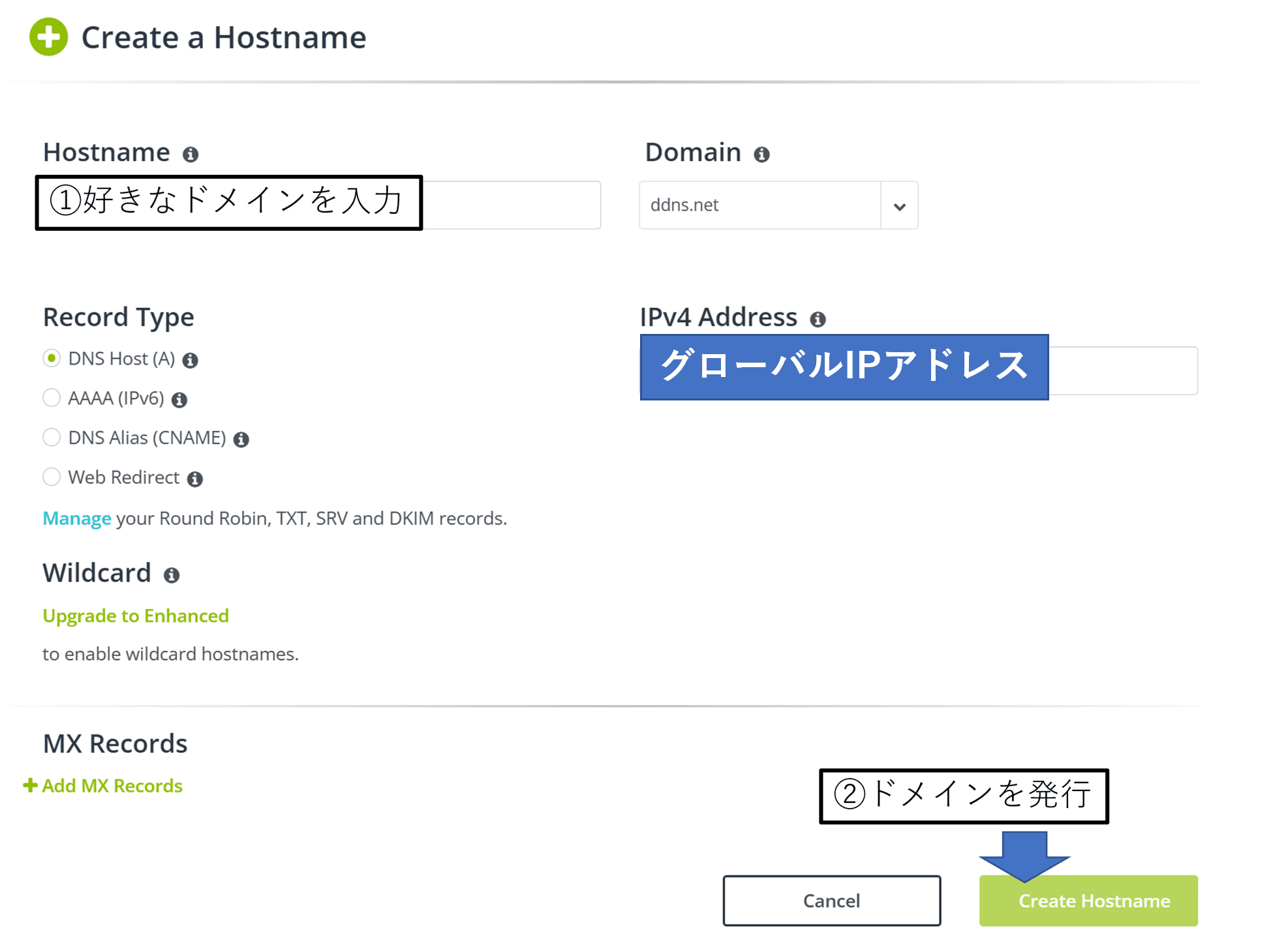 - Create Hostname」を押して、以下の内容を入力します。